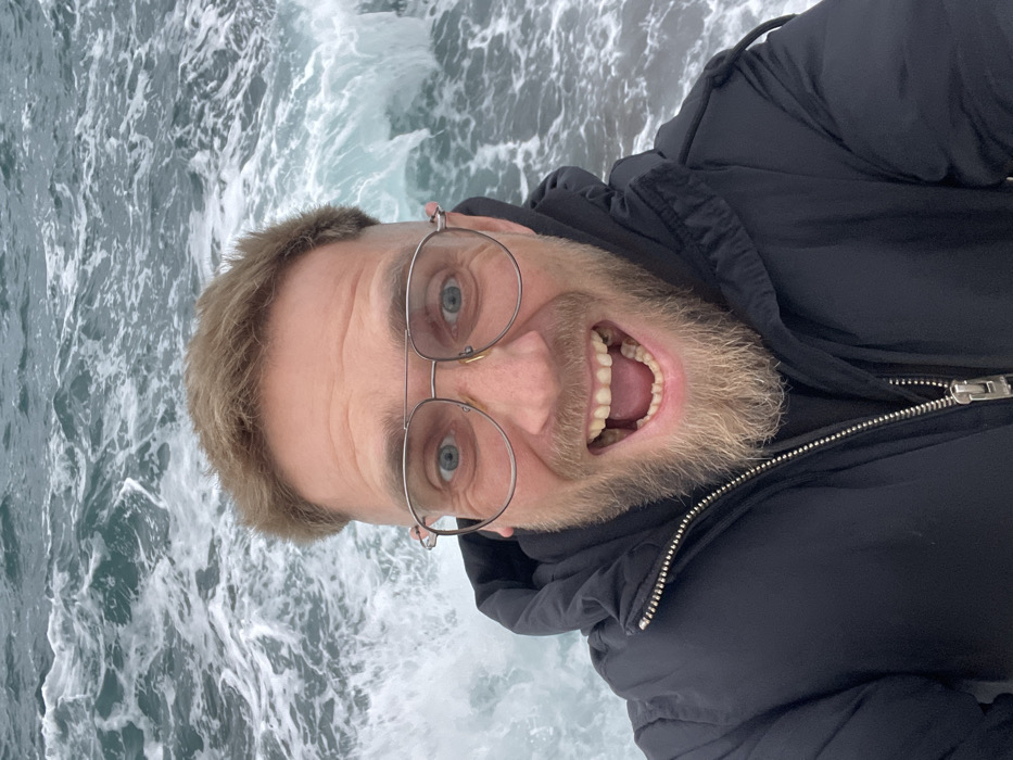 An adult male subject is depicted in a close-up, chest-up portrait shot against a turbulent sea backdrop