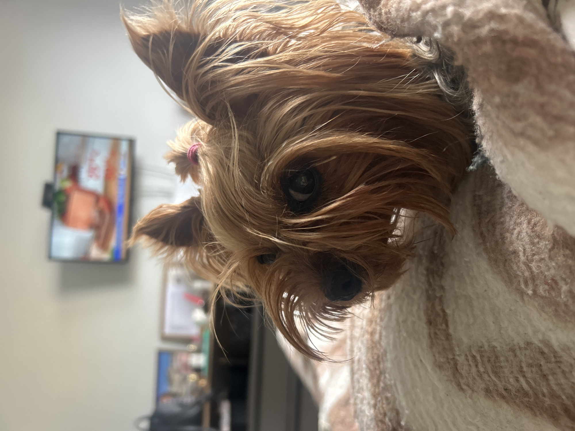 A close-up, tilted, indoor shot of a small, brown, long-haired dog partially wrapped in a striped blanket. The dog has its ears perked and a small pink band in the hair on one ear. The dog's black nose and eyes are prominent. The background shows a wall with a television and some framed items. Based on the image, there is no evidence to identify that this image was taken in Burgas, Bulgaria.