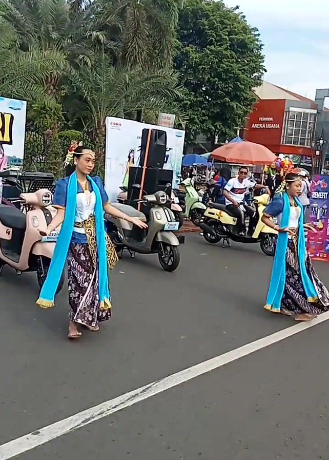 Two women dressed in traditional Indonesian clothing are performing a dance in a street parade. The women are wearing long, patterned skirts and blue sashes. They are standing next to parked motor scooters. There are other people and vehicles in the background, as well as trees and buildings. The sky is overcast.