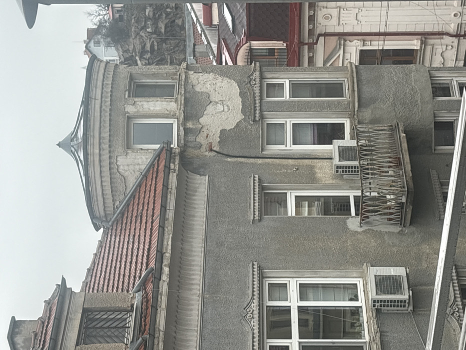 An exterior view depicts an architectural detail of a building in Plovdiv, Bulgaria