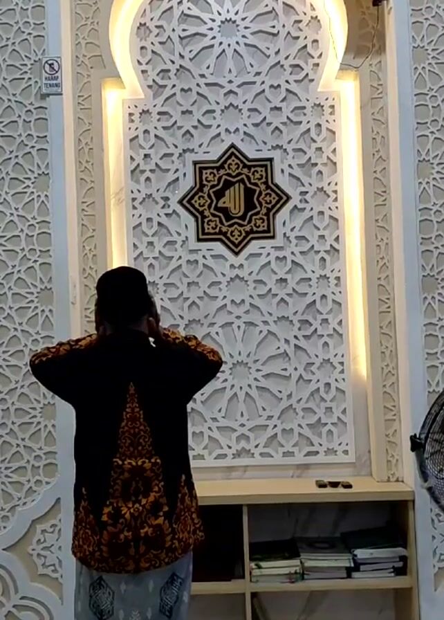 A man, seen from the back, is preparing to pray in what appears to be a mosque. He is wearing a black cap, a black jacket with ornate gold embroidery, and a patterned sarong. He has his hands near his ears. Behind him is a white wall decorated with intricate geometric patterns, with a large black and gold emblem of Arabic calligraphy in the center. Above the emblem, the wall is illuminated with a warm glow from lights embedded in the architectural design. To the right is a digital clock displaying prayer times. A sign reading "HARAP TENANG" (Please be quiet) is visible to the left, and a bookshelf with books is beneath the decorated wall. A fan is partially visible in the right background.