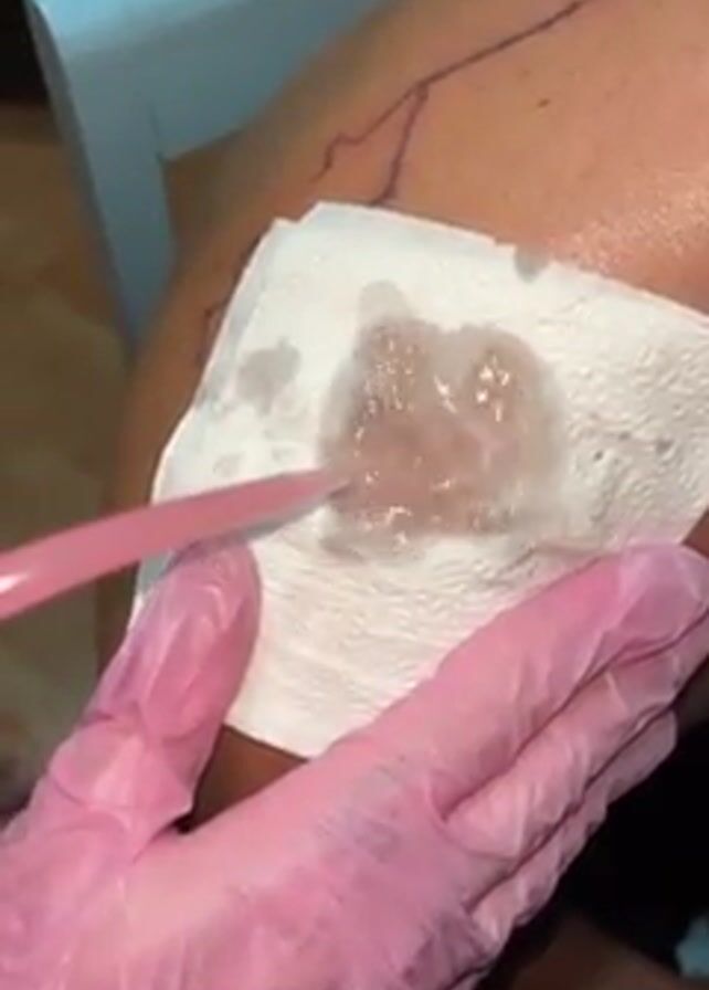 person with brown skin receiving a tattoo. The person’s shoulder is visible. A drawing of what appears to be mountain peaks is drawn on the shoulder in black ink. A person in pink gloves uses a pink tool to wipe the shoulder with a white napkin. The napkin has a clear and slightly bloody fluid on it. The person then uses the napkin to press and wipe the person's shoulder.