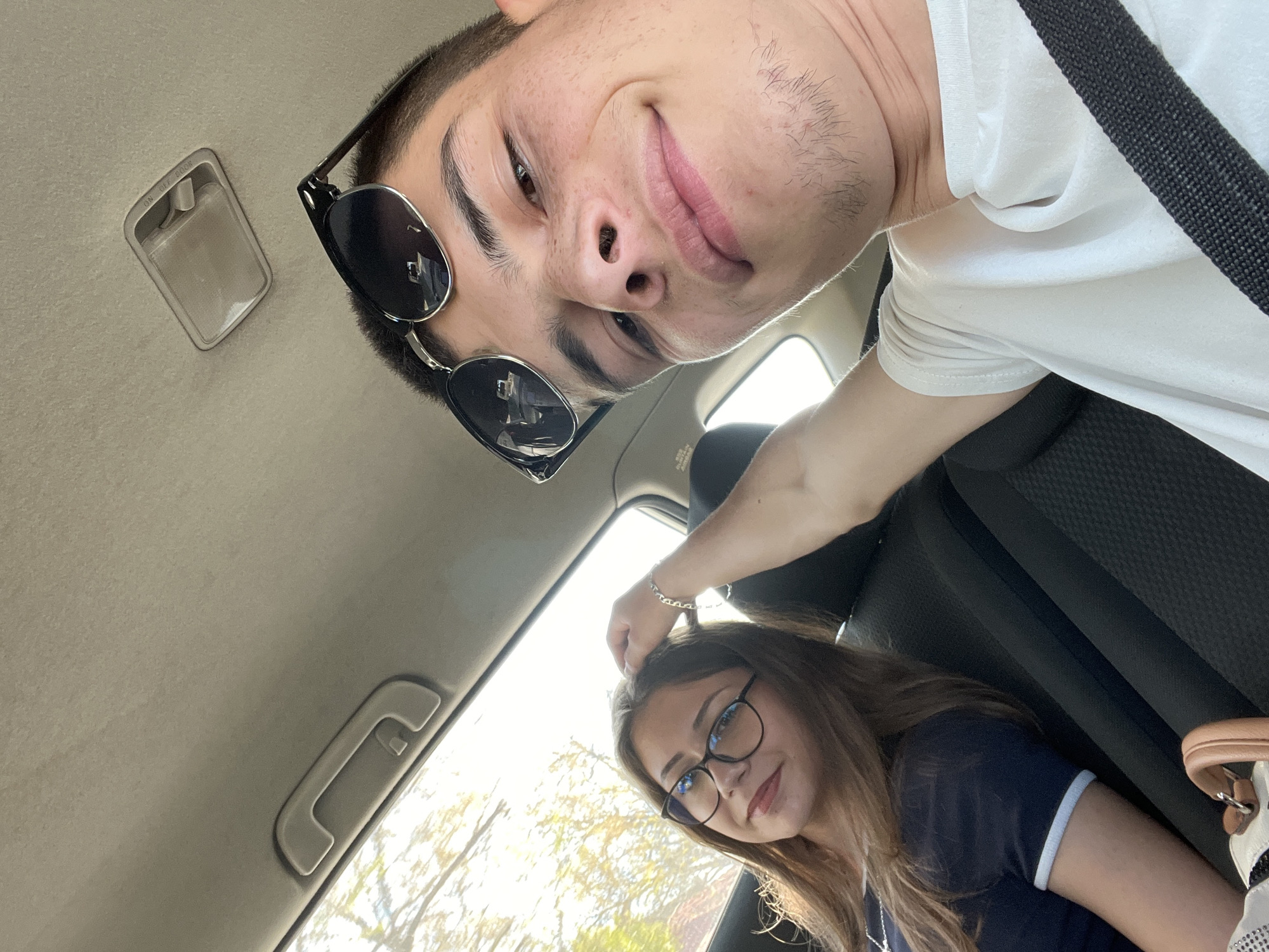 two individuals in a car, likely the driver and passenger. The driver, a young man, is wearing sunglasses perched on his head and a white t-shirt with a visible seatbelt. He is positioned closer to the camera, creating a skewed perspective. The passenger, a young woman, is wearing glasses and a dark blue top with white trim. A hand, presumably belonging to the driver, is placed on her head. The interior of the car is visible, including the ceiling, seats, and a passenger grab handle. Outside the window, there are trees, suggesting a location with greenery, although without further information, determining the city of Vasil Levski, Bulgaria as the location is impossible. The people appear to be interacting casually.