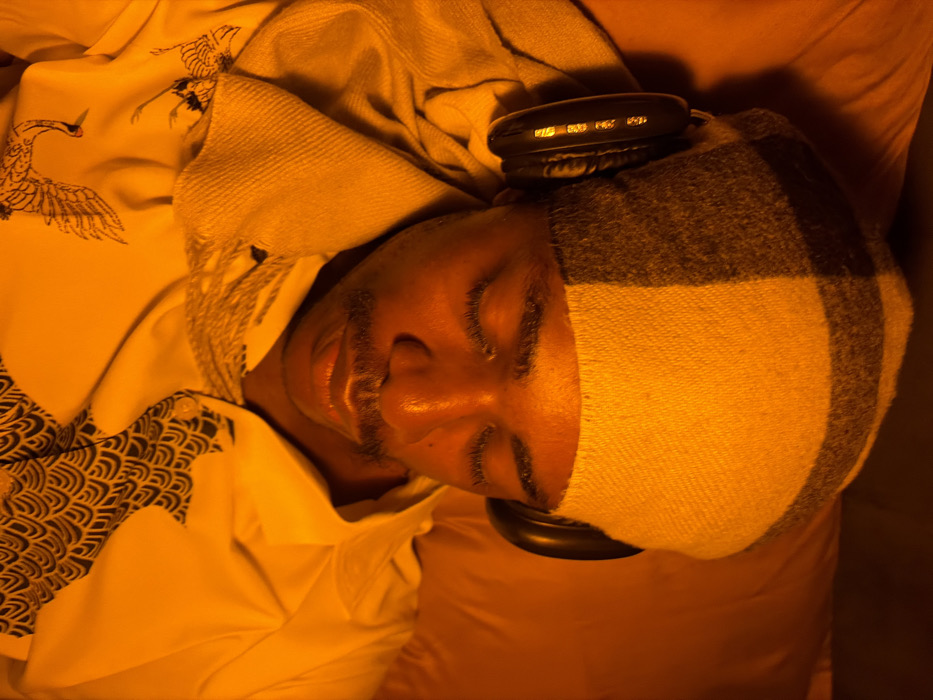 An individual rests with closed eyes. Headphones sit atop a checked blanket draped over their head. A patterned shirt with crane and wave designs is visible. The person is lying on an orange pillow or surface. The overall color scheme is warm, dominated by shades of orange and yellow, giving the image a cozy and intimate feel.