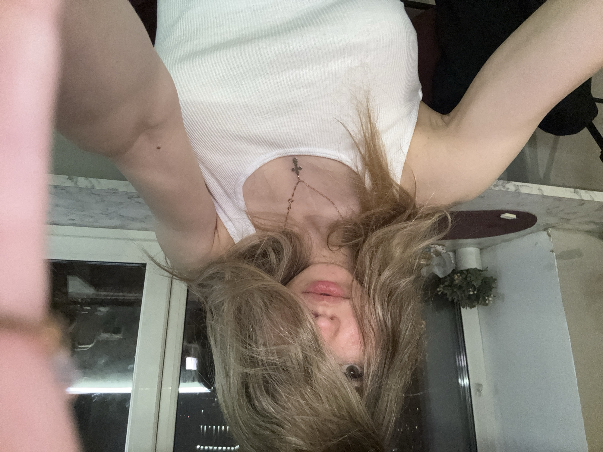 A young woman is upside down, possibly taking a selfie. She is wearing a white tank top and has blonde hair. A necklace with a cross is visible on her chest. The background shows a window with a view of what appears to be a city skyline at night. Based on the presence of Cyrillic characters on the cityscape, and the user's explicit location of Khimki, Russia, it is likely the cityscape is that of the city of Khimki or Moscow, Russia. There is a decorative arrangement of flowers and candles on the windowsill. The image is somewhat blurry, particularly in the foreground.