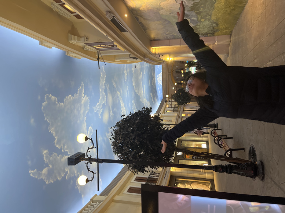 A woman with dark, curly hair and glasses stands in a faux outdoor setting, arms outstretched. The "sky" above is a painted mural of clouds and sky. Decorative facades of buildings line the sides, complete with balconies and lit windows. Period lampposts illuminate artificial trees and benches. The scene is captured at an angle, creating a disorienting perspective. A black rectangle, possibly a sign, is visible in the foreground.