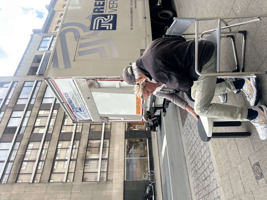 The image depicts an urban street scene in Antwerp, Belgium. In the foreground, on a concrete sidewalk, an older male, wearing a dark baseball cap, dark jacket, and light olive-green pants with white athletic shoes, is seated facing left in a grey folding chair. To his left, an older female with blonde hair, dressed in a light top and grey cardigan over dark trousers with white athletic shoes, leans forward with her right hand resting on a small, modern, round table featuring a black and white split-circle tabletop on black legs. In the midground, a large white moving truck from "RENDERS VERHUIZINGEN" (Renders Removals) is parked on a cobblestone street. The truck displays blue and red branding, an 'R' logo, and contact information including "Tel. 052/35.80.35 (LEBBEKE)". The rear of the truck includes a white liftgate with reflective markings and a Belgian license plate reading "1-NEBM-470". The background features a tall, multi-story building with a grey concrete facade and numerous rectangular windows to the left. A storefront at its base shows reflections. To the right, partially obscured by the truck, an older-style building is visible. A black car is parked behind the truck, and a bicycle is parked further down the street on the left. The sky appears overcast.