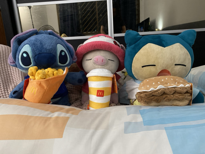 Three stuffed animals sit on a bed with patterned sheets. On the left, Stitch holds a plush McDonald's french fry container filled with what appears to be nuggets. In the center, a pig plushie wearing a red and white hat holds a McDonald's soda cup. On the right, a Snorlax plushie with closed eyes rests its head on a plush hamburger. A mirrored closet is in the background.