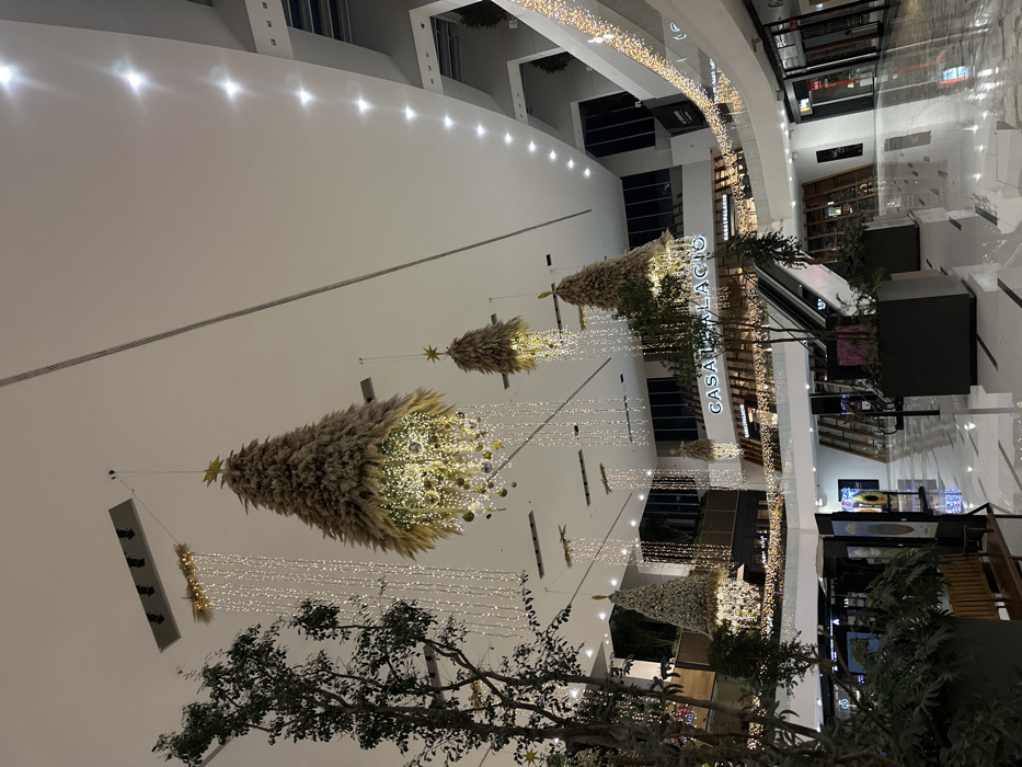 Inside a modern shopping mall, several upside-down Christmas trees are suspended from the ceiling. The trees are decorated with lights and ornaments. Below the trees, there are trees and plants in planters. A high-end department store, "Casa Palacio," is visible in the background. The mall has a multi-level design with escalators. The interior is well-lit and spacious.