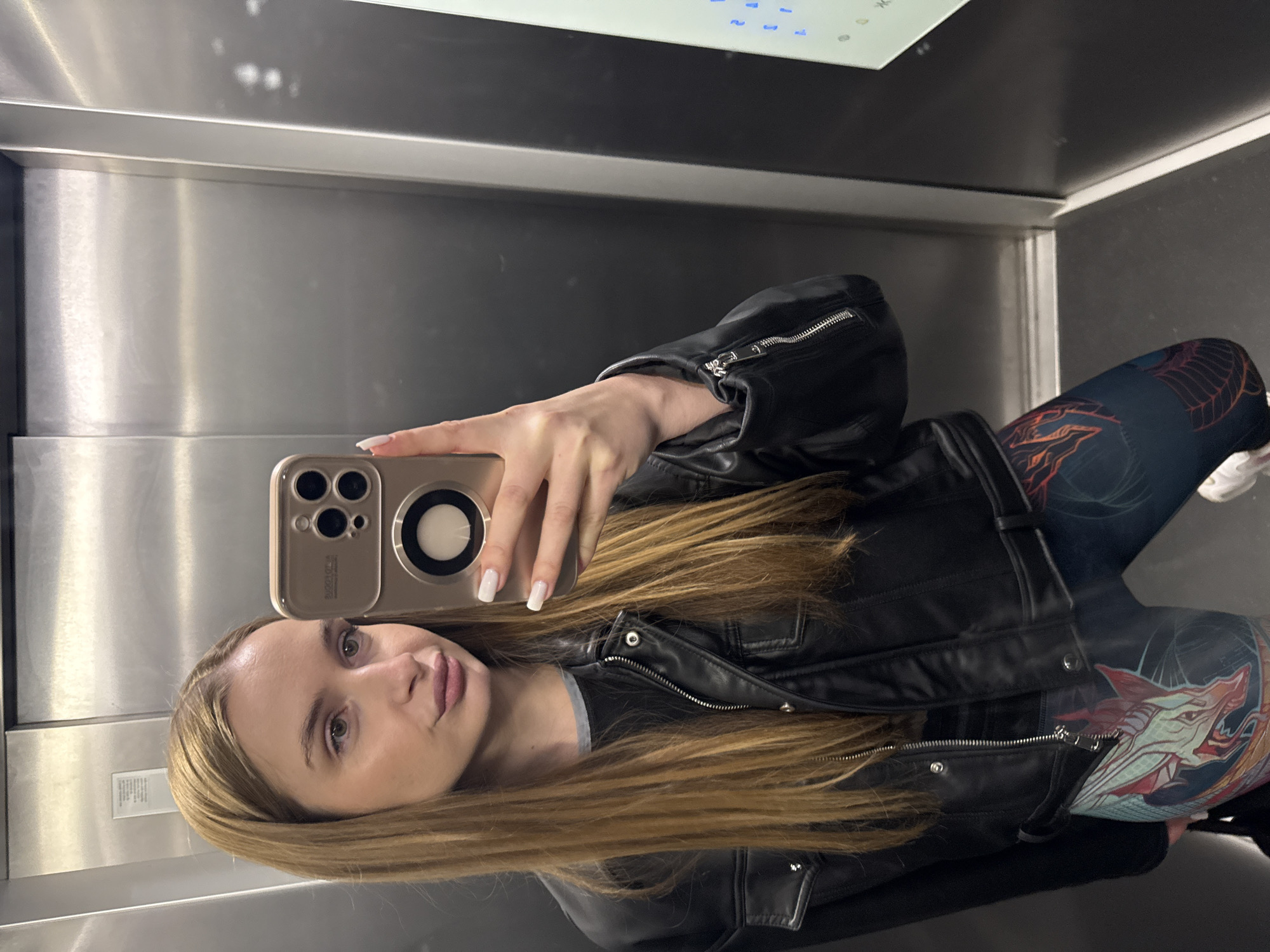 A woman is taking a selfie in what appears to be an elevator. She is holding a gold-colored iPhone with a circular camera detail in front of her face. She has long, blonde-brown hair and is wearing a black leather jacket and printed leggings. The elevator walls are metallic and silver, with a control panel visible near the top. The location is unknown and cannot be identified from the provided image.