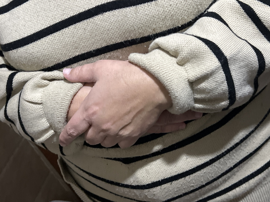 - "A close-up shot shows a person's hands clasped over their stomach" by FM-PwtkB2, licensed under CC BY 4.0