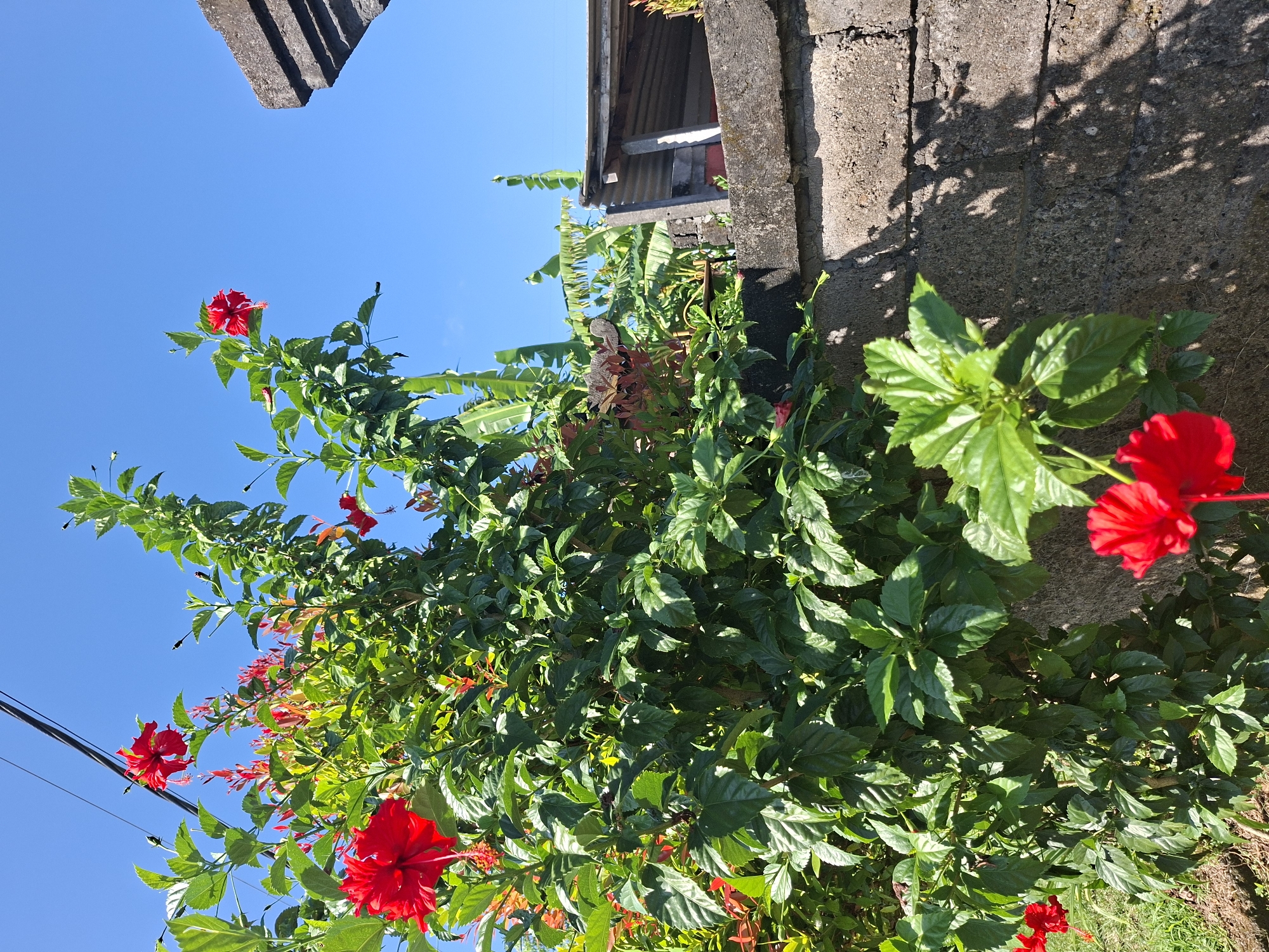 vibrant, red hibiscus bush growing next to a concrete wall in Lodtunduh, Indonesia. The blue sky is visible above the bush. A portion of a building with a metal roof is seen above the wall. The image captures the bright sunlight illuminating the scene.
