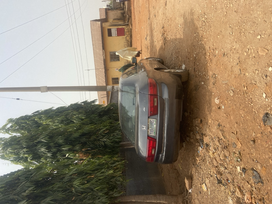 The image depicts an outdoor scene in Nigeria, on an unpaved reddish-brown dirt road in the city of Unknown, Unknown. A dark gray Honda Accord sedan, bearing Nigerian license plate YAB-659BS, is parked facing away from the viewer on the left side of the road. To the left of the vehicle, a line of tall, slender evergreen trees borders a dark fence or wall. A concrete utility pole stands upright to the right of the trees, supporting overhead power lines that extend across a clear, light blue sky. Across the dirt road, several single-story, yellow-painted buildings with corrugated metal roofs are visible. Two individuals are walking away from the camera on the unpaved road in front of these buildings: one in a light-colored, full-body garment, and another further back in a darker garment. A third person is partially visible further down the road on the far right. The scene is illuminated by daylight, casting shadows.
