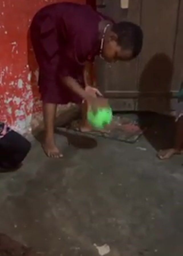 person bending over to pick up a small green ball. The person is barefoot and wearing a maroon outfit. The person stands on a small rug on a dark, seemingly wet floor. The room has a red wall with some discoloration, and a wooden door behind the person. Another pair of bare feet is visible in the background.