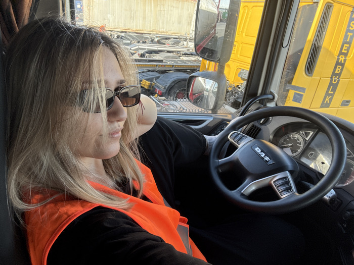 An adult female, with light blonde hair and dark rectangular sunglasses, is seated in the driver's seat of a DAF commercial truck in Kieldrecht, Belgium