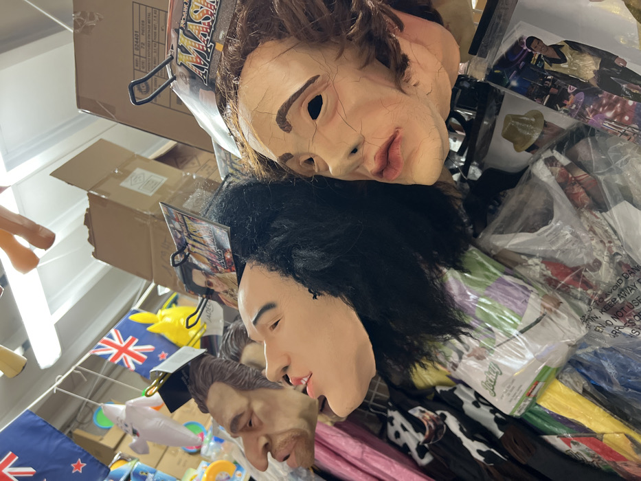 The scene captures an interior retail environment in Aubervilliers, France, characterized by a dense display of merchandise. Three rubber or latex masks are prominently featured in the foreground, suspended from metal hooks. The leftmost mask portrays a male caricature with an exaggerated nose and brown hair. The central mask features a pale, youthful face with black, shaggy hair, its packaging indicating "MASK" and displaying an image of a person in glasses. The rightmost mask presents a pale, aged, or distressed face with reddish-brown hair and a texture resembling cracked skin, also with "MASK" visible on its packaging. Beneath the masks, various packaged costume items and other retail goods are visible, including plastic-wrapped items, one bearing the brand "Jockey" and others showing images of individuals in costumes. The upper background reveals stacked cardboard boxes, fluorescent strip lighting, and multiple hanging decorations including the flag of New Zealand, the Union Jack flag, a yellow cartoon figure, and a white banana-shaped object.
