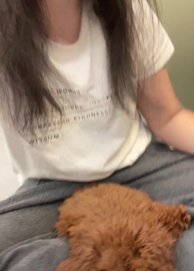 A woman with long brown hair is sitting with her legs crossed. She is wearing a white t-shirt with words printed on it and gray pants. A small brown dog is lying on her lap. The woman reaches down and gently pets the dog. The background appears to be a room with light-colored walls.