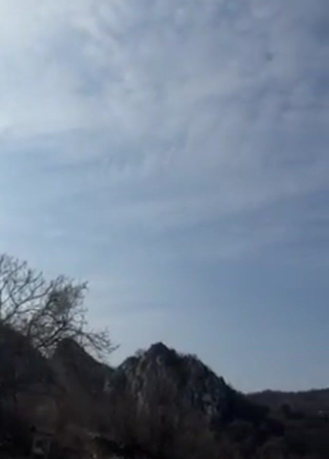 landscape of rocky hills against a blue sky with cirrus clouds. The foreground includes a bare tree and some greenery, suggesting early spring. The camera pans slowly to the right, revealing more of the hilly terrain. The overall impression is one of a rural, possibly mountainous area with a clear sky.