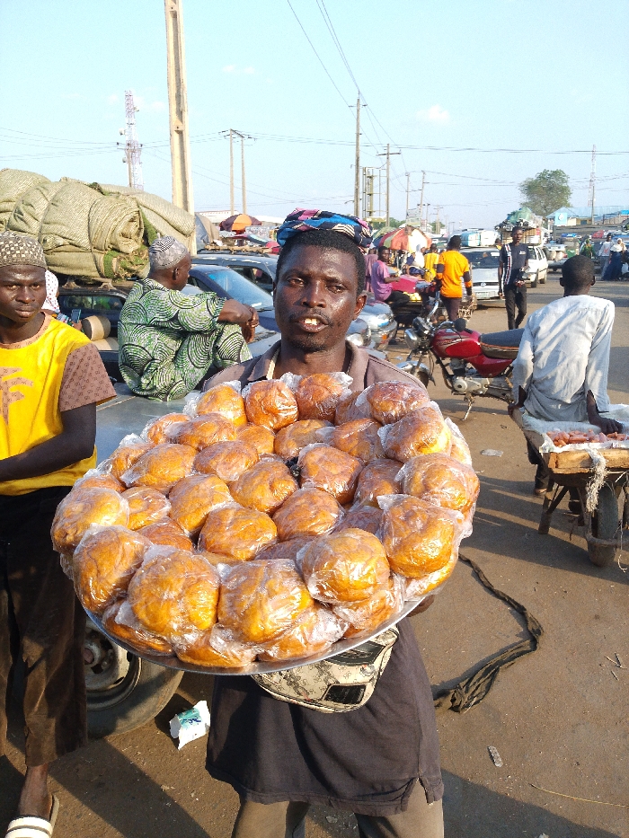A man holds a large tray covered with individually wrapped, golden-brown pastries in a bustling outdoor market. He wears a dark shirt and has a patterned head covering. The tray is balanced on his shoulders, and he looks directly at the camera. In the background, there are parked cars, motorcycles, other vendors, and pedestrians under a bright sky. The scene suggests a street food vendor in a lively urban setting.
