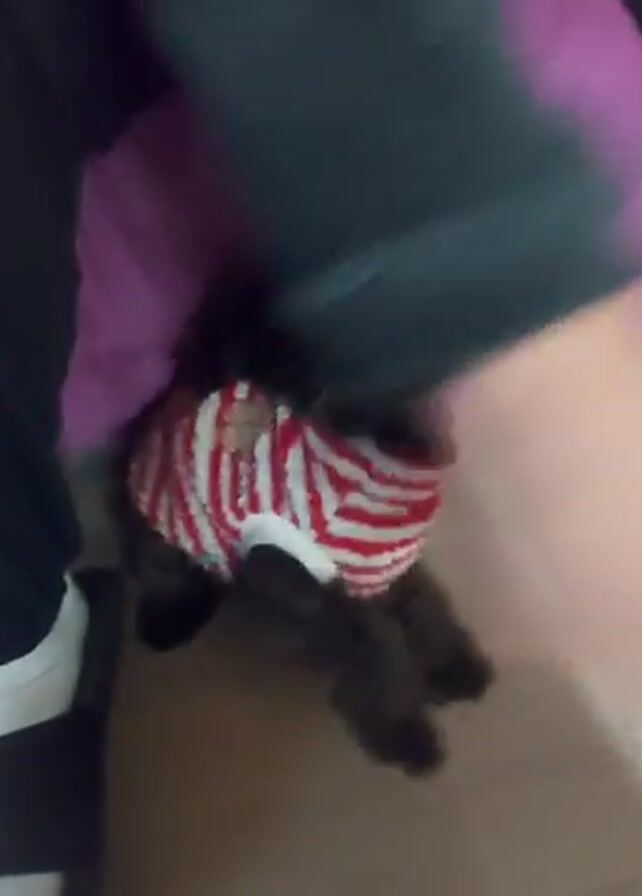 A person is sitting and petting a small, black poodle wearing a red and white striped sweater. The person is wearing black pants, a grey long-sleeved shirt, and black slides with white socks. A purple pillow is behind the dog. The scene is indoors, with light-colored flooring. The person's hand moves gently over the dog's back.