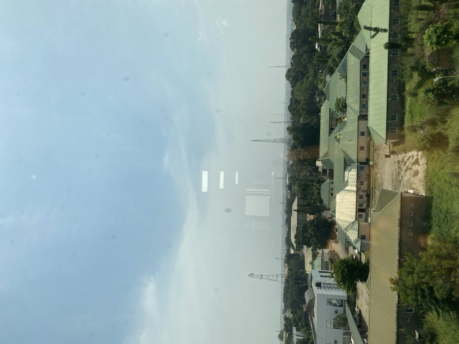 This image presents an elevated, wide-angle view of a section of Shaba, Nigeria, captured through a window pane exhibiting reflections and minor surface irregularities. The upper half of the frame depicts a partly cloudy blue sky. Below, an urban landscape is visible, characterized by numerous single and two-story buildings. The predominant architectural style features light-colored walls and distinct light green corrugated metal roofs. One prominent building in the midground has a lighter, possibly beige, colored roof. The area is interspersed with abundant green vegetation, including mature trees and dense foliage. Several tall, lattice-structured communication towers rise from the distant cityscape, which extends towards a hazy horizon. No individuals, specific actions, or interactions are discernible.