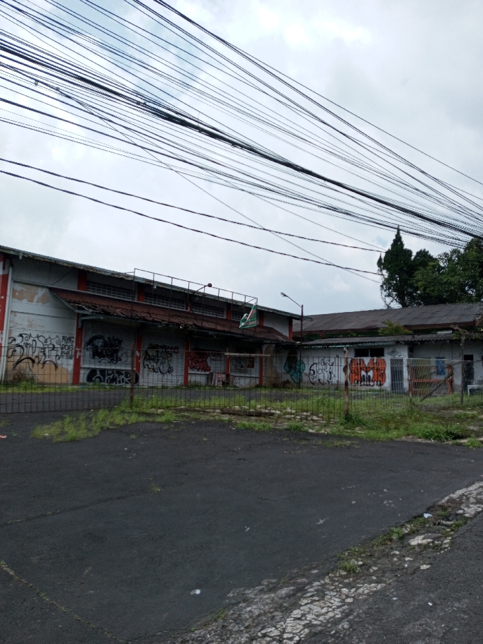 The scene depicts a neglected urban landscape in Chendenbji, Bhutan, under an overcast sky. Overhead, a dense network of black utility wires crisscrosses the frame. In the midground, a two-part building complex is visible. The left section is a taller, two-story structure with faded white and red paint, featuring multiple closed metal roll-down shutters heavily covered in black and white graffiti. Above these shutters, a shaded overhang is present, topped by a horizontal row of windows or vents. A small, triangular flag, predominantly green and white, is attached to the upper facade of this building, near a street lamp. The right section is a lower, single-story extension with a dark, corrugated roof, also exhibiting graffiti, including prominent orange and white markings. A blue fabric item hangs near a window on this section. A low, dark metal fence with vertical bars separates the buildings from the foreground. The foreground consists of a dark, cracked asphalt-like paved area with numerous patches of green weeds. A rougher, cracked paved surface with additional weeds borders the right side of the frame. In the background, behind the buildings, dark green trees and a tall, slender conifer are visible. No people, animals, or vehicles are present in the scene.