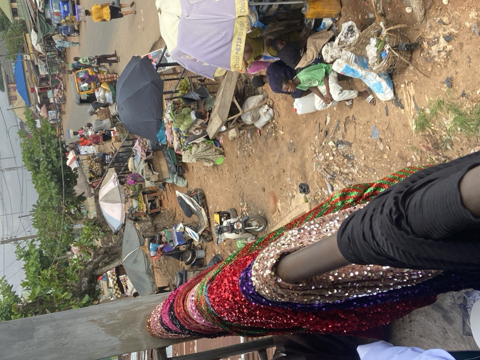 The image captures a bustling outdoor street market in Ojoto, Nigeria, viewed from an elevated perspective under an overcast sky. In the immediate foreground on the left, a concrete pillar abuts a metal railing over which multiple rolls of sequined fabric are draped, showcasing various colors including red, gold, purple, black, green, and pink. A dark-skinned arm, clad in a black ribbed long-sleeved garment, extends from the left towards these fabrics; part of a white shirt is also visible. The midground features an unpaved, reddish-brown dirt ground, littered with debris and sparse green vegetation. Several motorcycles and scooters are parked on this ground, including a white scooter, a black scooter with a yellow cargo box, and another dark scooter. Numerous market stalls line this area, constructed from wood, displaying various goods such as fruits (pineapples, watermelons, oranges) on tables and tarps. Several open umbrellas provide shade: a black umbrella covers a produce stall, and a purple and white umbrella, bearing the text "Dial *671#," shades a small gathering. Beneath the purple and white umbrella, three individuals are seated on a low wooden bench; one young male wears a light green shirt and white pants, positioned next to a white plastic jerrycan. A yellow jerrycan is also present nearby. The background reveals an asphalt road with ongoing pedestrian and vehicle traffic. A yellow three-wheeled motorized rickshaw (Keke Napep) is visible on the road, surrounded by standing individuals. A blue car is parked further down the street. Pedestrians walk along the road and sidewalks, including a woman in a yellow top walking away from the camera on the right. Beyond the road, a line of single and multi-story buildings of varying architectural styles and colors, some with "POS" signs, constitute the market's perimeter. Lush green trees are interspersed throughout the scene, particularly in the upper left and center.