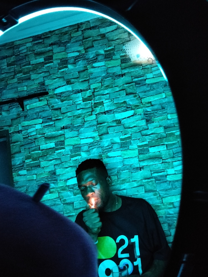A dark-skinned man is illuminated by the light of a lighter held to his lips. He wears a black t-shirt with the numeral "21" printed on it, stylized with different colors and orientations. He is positioned in front of a textured wall composed of horizontal brick-like patterns. A ring light partially frames the scene, casting a cool, bluish-green hue on the wall. The overall composition is dimly lit, focusing attention on the lighter's flame.