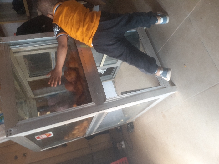 The image depicts an interior scene, reportedly in Gura Top, Nigeria. A young child, dressed in a yellow short-sleeved t-shirt with black trim, black trousers, and light blue and white sneakers, stands facing a glass display case. The child's left hand is pressed flat against the upper front glass panel of the case. The display case features a light-colored metal frame (likely aluminum) and glass panels, containing several round, fried, golden-brown food items. A red and white rectangular sticker is affixed to the upper left glass panel of the case. The floor consists of light brown or beige tiles. The background is indistinct, showing blurry shapes; a dark object and some wires are partially visible on the left, and a shelf or wall section appears on the right.