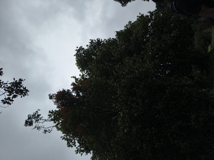 A cloudy sky looms above, partially obscured by dark green trees. One tree features hints of red flowers among its leaves. Branches extend from the left side of the frame. A blurry figure is visible in the top right corner.