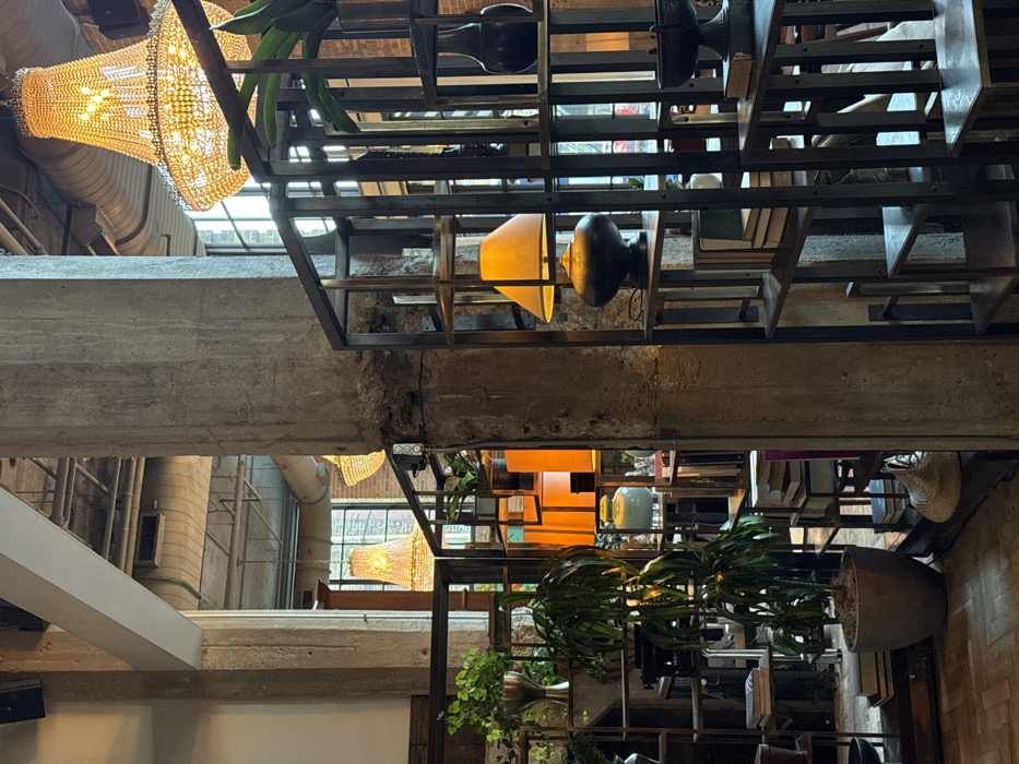 The image depicts the interior of a commercial establishment, likely a high-end restaurant, bar, or lounge. The specific location in the city of Unknown, Unknown, cannot be determined from the visual information. The environment blends industrial architecture with opulent decor. The scene features prominent, aged concrete columns showing wear and erosion. The ceiling displays exposed concrete beams, metal ductwork, and pipes. Natural light enters through large windows in the background, which reveal glimpses of an exterior brick building. The flooring appears to be hardwood or parquet. Lighting is provided by several sources, including two large, ornate crystal chandeliers with warm illumination suspended from the ceiling. Multiple table lamps with yellow fabric shades also contribute to the warm ambient light, one being prominently displayed on a shelf in the mid-right. The foreground and mid-ground are defined by dark metal or wooden multi-tiered shelving units that serve as room dividers and display spaces. These shelves are curated with various items: numerous potted green plants, including a large specimen in a gray pot on the floor in the lower-left; stacks of books; decorative vases (one dark, tapered vase on an upper right shelf, and a light blue/green ceramic vase in the mid-left); a dark, wide bowl or urn on a lower right shelf; and a woven straw basket on the floor beneath a shelf in the lower-mid-left. An antique-style object, possibly a typewriter, is visible on a shelf in the mid-left. No people, actions, or interactions are visible within the frame; the scene is static and unoccupied.