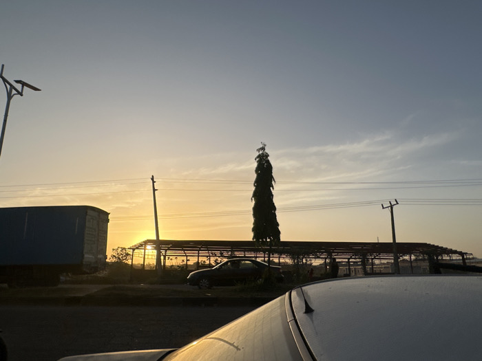 The image displays an outdoor scene at sunrise or sunset in Television, Nigeria, characterized by a low sun casting long shadows and illuminating the horizon in orange and yellow hues, transitioning to pale blue-grey in the upper sky with scattered cirrus clouds. On the far left, a dark-colored street light pole with a solar panel array and an LED fixture is silhouetted. A large, dark blue or grey shipping container or truck trailer is partially visible to the right of the street light. Centrally, a tall, slender tree with dense, dark foliage stands silhouetted, alongside a wooden utility pole supporting multiple power lines. In the midground to the right, a large, open-sided structure with a metal framework roof is visible, also silhouetted against the bright horizon. A dark-colored sedan is parked or in motion in front of this structure. The bottom right foreground is occupied by the hood and roofline of a light-colored vehicle, featuring a shark fin antenna, suggesting the vantage point of the photographer. No distinct human figures or specific actions are discernible.