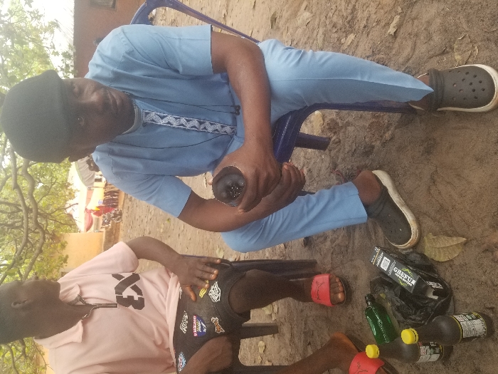The image depicts an outdoor scene in Ochadam, Nigeria, featuring two male subjects seated on chairs on sandy ground. In the foreground on the right, a dark-skinned male, estimated to be in his 30s-40s, wears a dark flat cap, a light blue short-sleeved shirt with a patterned neckline, light blue trousers, and black clogs with white soles. He is seated on a blue plastic chair, holding a dark, possibly metallic or ceramic, cup or container in both hands, and looking towards the right of the frame. To his left and slightly behind, a second dark-skinned male wears a light pink polo shirt with a black "EX" logo, dark shorts with multiple patches, and red slide sandals. He is seated on a dark chair and faces away from the camera, looking towards the left. On the sandy ground between the two subjects, two brown plastic bottles with yellow caps are visible, along with a green glass bottle lying on its side. A black plastic bag contains a partially visible white box labeled "GRETUE." Several dried leaves are scattered on the ground. The background reveals an unpaved area with a light-colored building. Further back, under the canopy of a large tree, a red structure resembling a tent or awning is visible, with a red motorcycle partially discernible nearby, suggesting a communal or market area. The scene is illuminated by natural daylight.