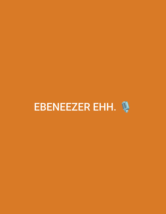The image displays a solid orange background. Centered horizontally and slightly below the vertical midpoint, white capitalized text reads "EBENEEZER EHH." Immediately following the text is a blue and silver microphone emoji. No people, discernible actions, or physical interactions are present. The environment is a uniform color field; no specific real-world location in the city of Unknown, Unknown, is identifiable.