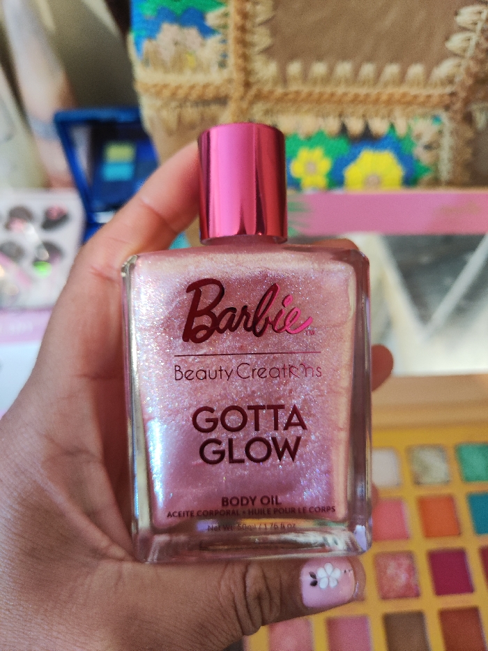 A hand holds a square bottle of "Barbie Beauty Creations GOTTA GLOW" body oil. The oil appears shimmery and pink. The bottle has a pink cap and clear label with dark pink lettering. “BODY OIL” and its Spanish and French translations are printed at the bottom. A multicolored eyeshadow palette and various beauty supplies are blurred in the background, creating a cluttered aesthetic. The manicured fingernails display a delicate flower design.