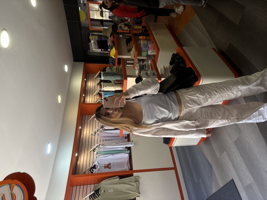 The image captures the interior of a retail store in Chablekal, Mexico. In the foreground, a young female with long brown hair is taking a mirror selfie, holding a light pink smartphone at chest level. She is wearing a light blue cropped tank top, an open light beige zippered hoodie, and light beige wide-leg pants. A black shoulder bag is visible on her left side. Her lips are slightly puckered. The store features orange-framed slat walls displaying various apparel items on hangers, including a light olive green t-shirt and several light-colored hoodies, one with a large orange "A" logo. White and orange tiered display units are stocked with merchandise such as multi-colored insulated tumblers, hats, and folded clothing. The floor has a geometric pattern of blue and grey tiles. In the background, to the right, a woman in a red long-sleeved shirt is partially visible, facing away from the camera, and the lower half of another person wearing white sneakers is also present. The ceiling is white with multiple recessed circular lights.