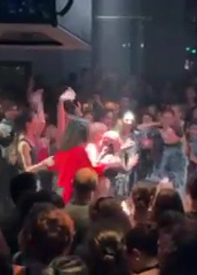 large, diverse crowd of people dancing at a club. The room is dimly lit with disco balls hanging from the ceiling and haze in the air. Most people are facing the center of the dance floor with some waving their hands in the air. Some are holding up phones and recording. A person in a red shirt is central in the crowd, dancing with someone in a yellow top. The crowd appears enthusiastic and energetic.