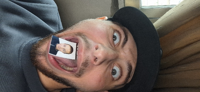 A male subject is depicted in a close-up, low-angle image captured indoors within Rukn ad-Din Municipality, Syria. The subject, appearing to be an adult male with a beard and mustache, is wearing a dark baseball cap and a dark grey crew-neck sweatshirt. His eyes are wide, and his mouth is open in an exaggerated expression, revealing his tongue. A small, vertically oriented photograph is resting flat on his tongue. The photograph displays a lighter-skinned individual, possibly male, with short hair, wearing a dark garment, looking directly at the viewer against a light background. The background of the scene includes a window frame in the upper left, admitting natural light, and angled wooden wall or ceiling panels to the right and above the subject's head.