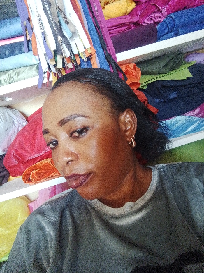 This image captures an adult female situated in what appears to be a textile or tailoring shop in Sabon Tasha, Nigeria