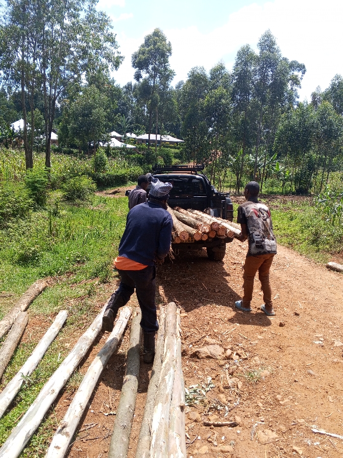 The image displays an outdoor scene in Getenga ward, Kenya, capturing three adult males loading timber onto a dark-colored pickup truck on a reddish-brown dirt track