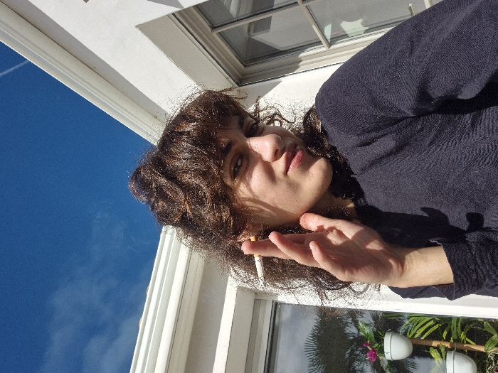 This image depicts a young adult positioned outdoors in Châtelaillon-Plage, France, under a clear blue sky exhibiting a faint contrail. The individual, with brown curly hair and bangs, wears a dark blue long-sleeved garment. They hold a lit white cigarette with an orange filter between the index and middle fingers of their right hand, which is raised with the palm partially visible. The subject is looking directly at the camera. The background features a white building structure, including a visible white gutter system and a multi-paned window on the right side. To the left, a tiered stand supports two white potted plants; one displays pink flowers, and the other contains green foliage. The scene is brightly illuminated by daylight.