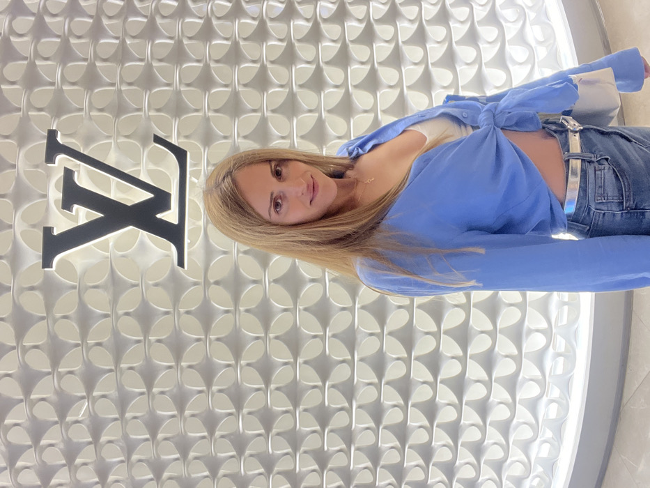 A female subject is depicted from the waist up in a well-lit indoor environment. She has long, light brown hair and is looking directly at the camera with a slight smile. She wears a light blue long-sleeved button-up shirt, tied at the waist, revealing a white top underneath and a segment of her abdomen. She is also wearing blue denim jeans and a metallic silver belt. A delicate gold-colored necklace with a small pendant is visible. A light-colored small bag or purse is partially visible on her left side. The background features a distinctive white, textured wall composed of repeating, illuminated, curvilinear elements. Above the subject's head, a prominent, backlit black "LV" (Louis Vuitton) logo is displayed against this wall. The scene is consistent with the interior of a Louis Vuitton luxury boutique located within a prominent shopping mall in Bangkok, Thailand, such as Siam Paragon.