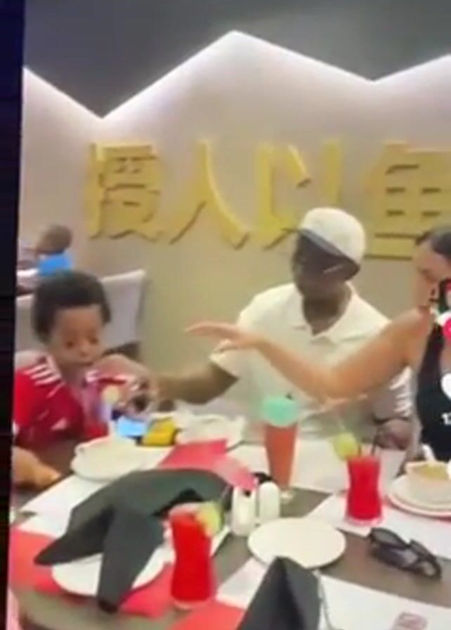 group of people dining at a restaurant with Chinese writing on the wall. The camera is focused on an older man wearing glasses and a white hat and polo shirt. He is seated at a table with others, including a woman in a black tank top and a child wearing a red shirt. There are plates, drinks, and napkins on the table. The background includes other diners and a brightly lit interior. The video is a recording of a smartphone screen displaying a TikTok video, complete with the app's interface elements like usernames, video descriptions, and interaction icons.