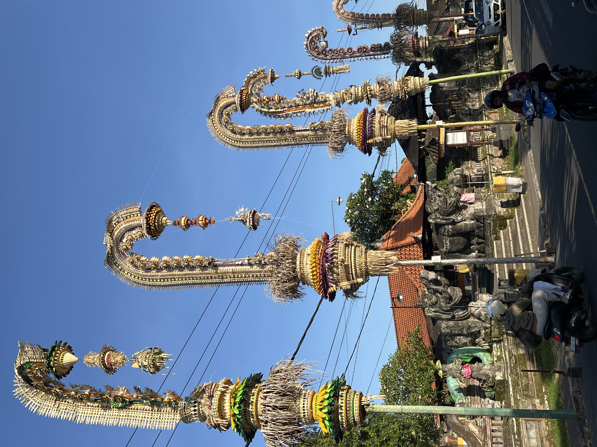 The image depicts a street scene in Blahbatuh, Indonesia, under a clear blue sky. Tall, elaborately decorated bamboo poles, known as Penjor, line the side of the road. These Penjor are adorned with woven decorations, tassels, and offerings, indicative of a Balinese Hindu ceremony or festival. A person on a motorcycle is visible on the right side of the frame, facing the camera. A car, also on the street, is further in the distance. In the background, there are traditional Balinese structures, possibly temples or residences, featuring intricate stone carvings and terracotta roofs. Utility poles and wires are strung overhead, cutting through the sky. The overall scene suggests a cultural event or religious celebration is taking place in this location.