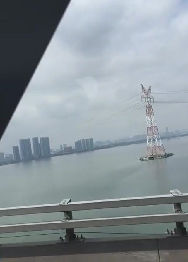 view from a moving vehicle, possibly a car or train, crossing a bridge. The landscape includes a large body of water, possibly a river or bay, with a distant cityscape visible on the opposite shore. A prominent feature is a tall, red and white electricity pylon standing on a platform within the water. The sky is overcast with gray clouds, creating a muted, somewhat hazy atmosphere. The bridge's railing is visible in the foreground.