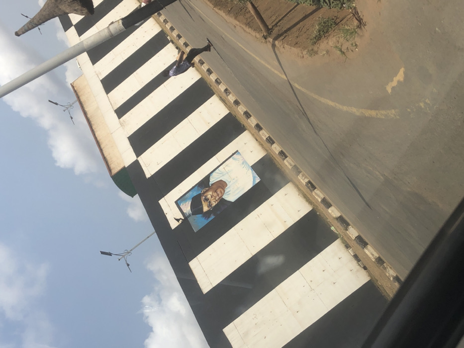 The image depicts an outdoor urban scene in Umuokpu, Nigeria, viewed from a slightly tilted perspective, possibly from a vehicle. A prominent concrete wall, painted with alternating vertical black and white stripes, forms the left and center background. Embedded within these stripes is a rectangular mural featuring a portrait of an individual: an older man with light skin, wearing eyeglasses, a white collared shirt, and a dark cap, with a slight smile. Adjacent to the wall is a paved asphalt road, separated by a black and white striped curb. Faint yellow road markings are visible on the asphalt. To the right of the road, a single person is walking away from the camera, dressed in a dark shirt and dark trousers. Further to the right, a tall utility pole is present, along with another partial, textured pole or tree trunk. The sky above is partially cloudy with visible blue areas. Multiple streetlights or light fixtures are mounted on poles in the background. The immediate foreground shows a dark, blurred section, consistent with a vehicle's interior.
