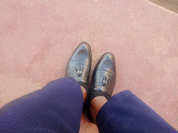 The image, taken from a first-person, downward-facing perspective, displays the lower legs and feet of an individual positioned on a reddish-brown, textured ground surface in Kakamega, Kenya. The individual wears dark blue trousers and a pair of dark, possibly black, slip-on formal shoes featuring decorative tassels and perforated detailing on the toe caps. Dark-colored socks are visible between the trouser cuffs and the shoes. The ground surface appears to be a paved area, possibly concrete, exhibiting a slightly worn and granular texture with minor discolored patches. No other individuals or distinguishing environmental features are present beyond the immediate ground.