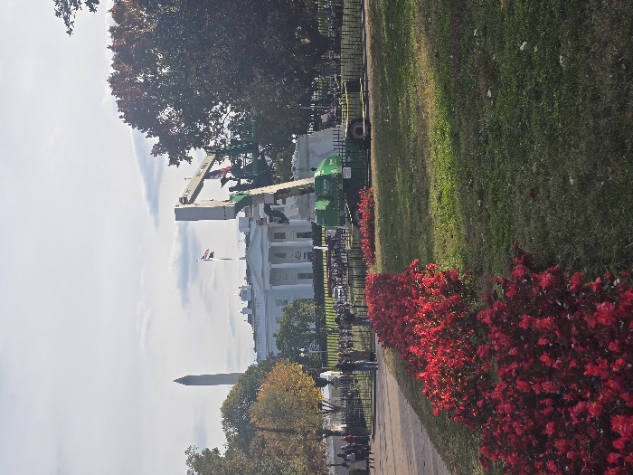 The image depicts a daytime outdoor scene from Lafayette Square, Washington, D.C., facing south towards the White House. In the foreground, a dense, linear bed of vibrant red annual flowers borders a paved walkway to the left, with green grass occupying the remainder of the lower frame. A black metal fence delineates the midground, where multiple pedestrians are visible walking. A large green and white articulated boom lift is positioned centrally to the right, with its multi-segmented arm extended upwards. An American flag is attached to the lift's elevated platform, which contains at least one person. The White House, a white neoclassical building featuring a prominent portico with columns and an American flag flying from its roof, is centrally located in the background. To the left of the White House, the Washington Monument, a tall obelisk, is visible. Deciduous trees displaying green and yellow autumn foliage are scattered throughout the midground and background. The sky above is partly cloudy.