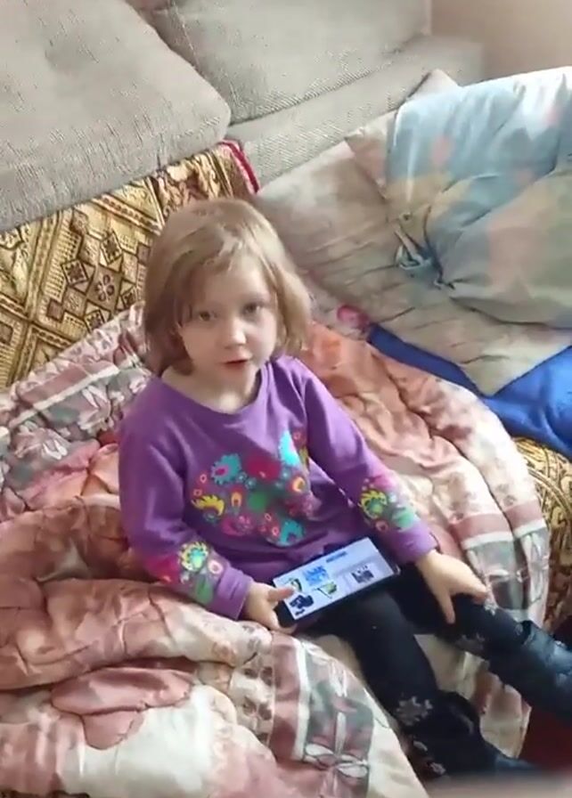 A young girl sits on a patterned blanket on a sofa, engrossed in a tablet. She is wearing a purple long-sleeve shirt with colorful flowers, black leggings, and black boots. The sofa has several pillows. She looks at the camera briefly before returning her attention to the tablet. The overall setting appears to be a casual indoor environment.