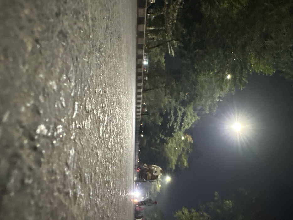 A low-angle shot shows a wet asphalt road at night, reflecting light. A curb with black and white stripes separates the road from a line of trees and lampposts. In the distance, a bright light, possibly the moon or a streetlight, shines through the trees. Silhouettes of people and a horse-drawn carriage are visible on the road under the light. The overall scene is dark and slightly blurred, emphasizing the wetness of the road and the nighttime setting.